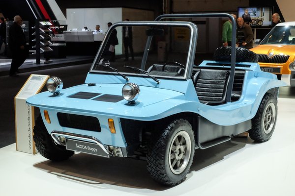 Eleve nem fér össze a fejemben a Škoda-logó alatt elterülő stand, egy fura Land Rover-szerűség, illetve egy babakék, hamisítatlan, amerikai dune buggy képe. Hatvanas-hetvenes évek fordulója és a Škoda név? Nekem bizony bénává faceliftelt, harmadik szériás 1000MB-k és lúdtalpas, nejlonzokni-szagú S100-ak jutnak eszembe, illetve a 1203-as furgon-borzalom, amihez képest egy Nysa kifejezetten üdítő látvány volt a forgalomban. Mi jött akkor a Škodától?