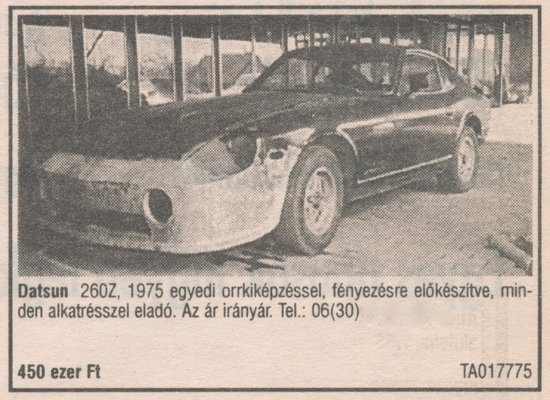 Ez az a hirdetés, amely alapján az előző tulaj vette meg a Datsunt, még egy másik évezredben. A lakatosmunka egyébként kiváló minőségű volt, nagyon szépen futottak a vonalak, és a két, kézzel alakított, egyedi lámpafészek is olyan szimmetrikusra sikerült, mintha gyári présgép gyártotta volna. De nem volt gyári. Az összességében olyan 25 centi extra túlnyúlás és ugyanennyi kiló az orr hegyén egy csomó kellemetlenség forrása lett, mindenhova odaért, sérült, semminek se tett jót. És kizárta az OT-t. Viszont hozott egy becenevet.