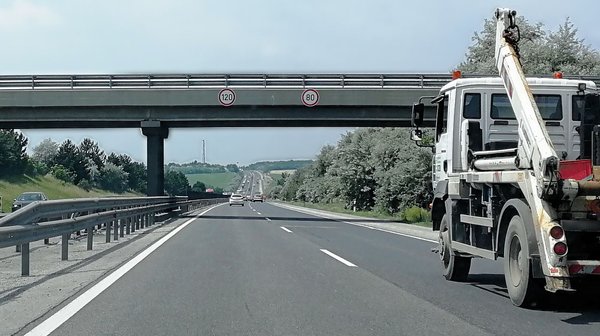 A képen jól látni, hogy a keresztező út, vagyis az autópálya felett átívelő híd pillérjére, a sávok fölé helyezték el a sebességkorlátozás jelzőtábláját.