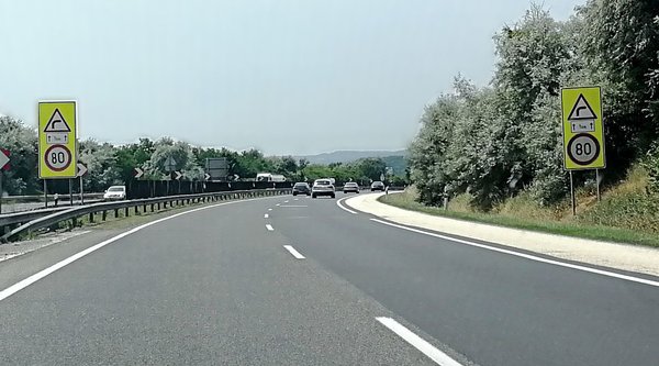 Ráadásul, ahogy az elején már írtam, a sávonkénti sebességkorlátozás kizárólag a sávok felett elhelyezett táblák esetén érvényes, ugyanis az út jobb oldalán elhelyezett jelzés (amely bal oldalon megismételhető) az úttest teljes szélességére érvényes, ahogy ezt láthatjuk az Óbarok utáni kanyarban, ahol mindkét sávban haladókra érvényes a 80-as korlátozás.