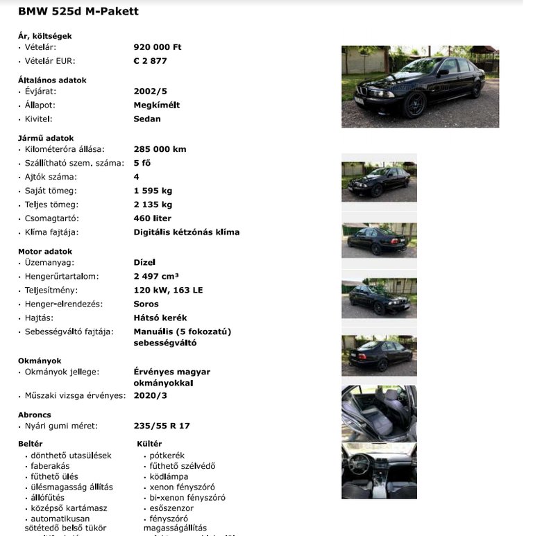 Az autót az általa átküldött hirdetési mentés szerint 700 ezer forintért kínálta eladásra májusban, majd hamarosan jött egy telefon a későbbi gödöllői vevőtől, aki már telefonon is alkudott százezer forintot, majd élőben még egy százast. Az illető egy szakértő barátjával érkezett, és azt hiszem, szerencséjük volt Lászlóval, mert ő nem akart meggazdagodni a több mint 400 ezer kilométert futott BMW eladásából. Pontosan tudta, hogy zörög a kéttömegű lendkerék, illetve rozsdásak a küszöbök, így belement az alkuba, és május 13-án eladta az autót.