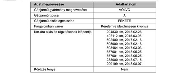 Persze a nagy svéd szedánt a rekord beállítása után is használták, de amikor júliusban újabb bejegyzés került az állami rendszerbe már csak 288 ezret mutatott a számláló, augusztus elején pedig 290-et. Bár a belügyi adatbázisban mindig voltak és lesznek hibás adatok, ráadásul ezeket nehéz utólag kijavítani, ezúttal valószínűtlen, hogy elírás történt, hiszen egymás után két kilométeradat is megerősíti, hogy lefelezték a Volvo óraállását, és 280 ezret mondott a kereskedő is a telefonban. Ezek szerint tévedett, vagy ő sem tudta, hogy mit árul. Sajnálatos.