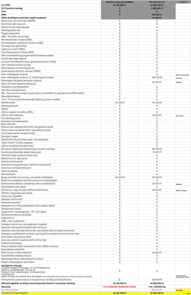 A március 9-én megjelent, Nem találok hárommillió forintot című cikkünkhöz érkezett ez a levél a Hyundai magyarországi importőrétől. Elég velős, a lényeg: a Hyundai termékspecialistái, összevetve a tesztben szereplő, csúcsfelszereltségű Santa Fe listaárait a hasonló felszereltségre hozott Kia Sorentóéval, úgy találták, hogy valójában az említett árkülönbség nem három, hanem kevesebb, mint egymillió forint, vagyis ezen az árszinten 5,9%. Néhány ponton a Kia, mivel régebbi modell nem kaphatja meg ugyanazt az extrát, vagy az egy korábbi, egyszerű verzió, ezt a megjegyzés rovat tartalmazza. Íme a levél és a számítások: