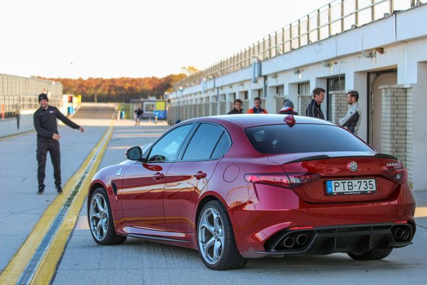 Jól működnek az adaptív lengéscsillapítók is: amikor kell komfortos, az Alfa DNA kapcsolót RACE állásba kapcsolva sportosan feszes a csillapítás. Szerpentinen autózva maga a megtestesült tökéletesség: egy 4 ajtós GT-től ennél többet nem lehet elvárni. És mi a helyzet a Pannónia-Ringen, hogy szerepelnek a fejlesztések, ha maximum teljesítményt várunk el a technikától?