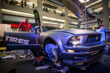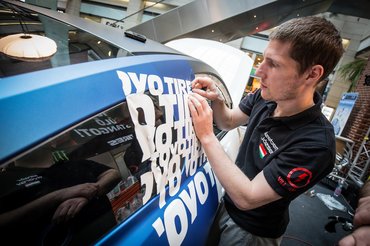 A belvárosi plázában kialakított arénában négy napon át tartott a munka. Ezalatt karosszériamódosításhoz a Rieger kínálatából választott komplett első lökhárítót, hátsó szoknyát és egy szárnyat szereltek fel, majd fóliába öltöztették az autót, egyedi Toyo kék-szürke dekort alkalmazva. Finom apróság, hogy a tükör burkolatában is ott a neves gumimárka neve, csak nem színnel, hanem aláfóliázással kialakított dombornyomással.