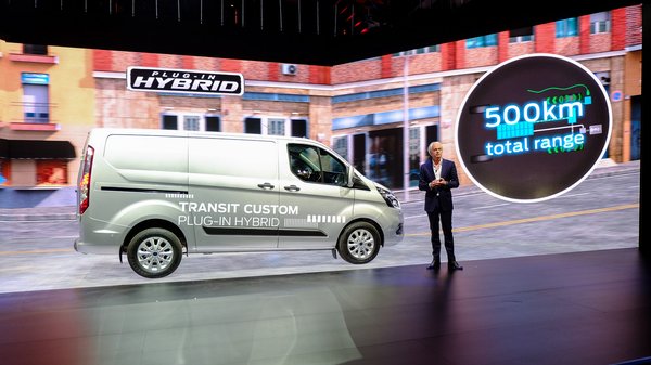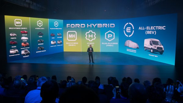 Aztán jött a lavina. Mutattak például mild hibrid Fiestát, Focust, Transitot, Transit Custom-öt, Tourneo Custom-öt, ezekben mindben nagy indítómotor/generátor van a benzin- vagy dízelmotoron, a háttérben egy 48 voltos elektromos rendszerrel és nagy akkuval. Ha a szó hagyományos értelmében nem is igazi hibridek ezek, mert a villanymotor csak mellékszerepet kap a hajtásukban, arra azért jó egy ilyen rendszer, hogy a fékezéskor veszendőbe menő energia egy részét elkapja, aztán később finoman visszatáplálja a mozgásba.