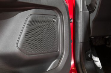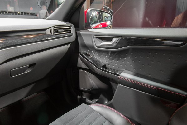 Itt ugye, a digiműszer eleve jó pont, az ajtókárpitok pedig szövetbetétesek, ráadásul kis, térbeli, kitapintható minták vannak benne – más fényben szerintem elég jól nézhet ki. Sajnos az amszterdami rendezvényesek valami gyilkos halogénfényekkel terítették be az autókat, amitől mindennek lett egy durván kékes árnyalata, ráadásul olyan erősek voltak a szpotok, hogy alattuk szerintem még a brikett is gyémántnak látszott volna. Mindenesetre itt is nagyjából olyan jó a puha-kemény műanyagok aránya, mint a Focusban, nagy baj nem lesz. Az ülés fasza, megvan a jó kis félretankolás-akadályozó betöltőnyílás – basszus, a rohanásban elfelejtettem csekkolni, hogy az aktív élvédők is ott vannak-e az ajtókon. Kicsit gyanús, hogy a becsukásakor nem hallottam a jellegzetes klattyanást. Ezt muszáj lesz ellenőriznem a valódi bemutatón.