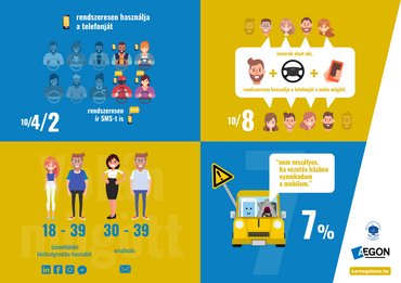 - Az üzenetküldés és a közösségimédia-használat kiemelkedő gyakorisággal fordul elő a 18-39 éves korosztályban, míg a vezetés közbeni e-mailezés a 30-39 évesekre jellemző, elsősorban azokra, akik vidéki városokban élnek.