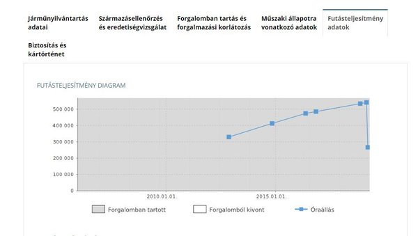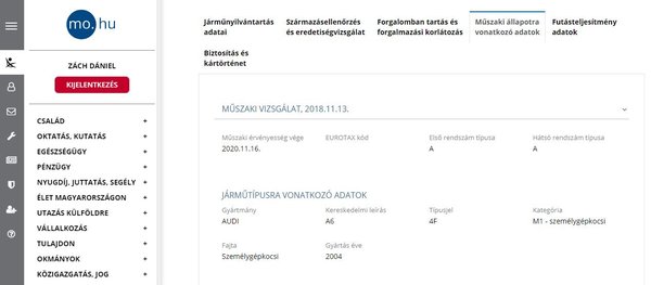 A platform nemrég átesett az első ráncfelvarráson. Azóta az ügyfélkapus belépést és a rendszám megadásával indított keresést követően már nem csupán egy több mint tízoldalas, letölthető PDF-fájlt kapunk eredményként, de az autók alapvető műszaki adatait, a vizsgákon rögzített információkat és fotókat, illetve a származásellenőrzés vagy eredetiség vizsgálat adatait, a futásteljesítmény-adatokat összegző táblázatot és grafikont is külön-külön kattintható fülek alatt nézhetjük át. Így pörgettem végig a félmillióról 266 ezerre visszarántott Audi történetét is.