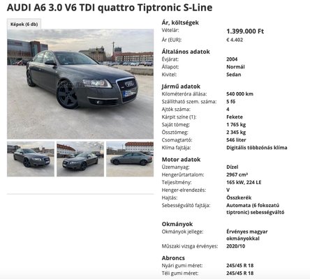 Az A6 2004-es gyártású, de 2005-ben helyezték itthon forgalomba és már 2010-ből is láthatunk róla műszakivizsga-fotókat. Ekkor 249 ezer kilométer volt benne, a 2012-es vizsgán már több mint 330-nál járt, vagyis a mostani óraállást nyolc éve érhette el először. Egy ilyen autó több mint félmillió kilométerrel kevesebb mint egymillió forintnyi eurót ér Németországban, bár alig találni ilyen sokat futott példányt a mobile.de-n és akár több mint kétmilliónak megfelelő összegért is elmehet, ha csak annyi van benne, mint amennyivel itthon eladták az óratekerés után. Ott sem ismeretlen ez a csalási forma, mégsem értelmetlen támpontokat gyűjteni a kinti kínálat árszintjéről, mielőtt bármit elhiszünk az itteni hirdetőknek.