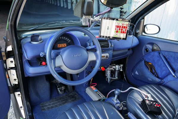 A Budapesti Műszaki és Gazdaságtudományi Egyetemről hívtak meg minket a tököli reptérre, hogy kipróbálhassuk az önvezető Smartot. Két ember még így is be tud ülni, és olyan cuccok vannak benne, mint a lézerszkenner, a 2 centi (!) pontosságú GPS és a nagysebességű adatátvitelt támogató rádiórendszer.