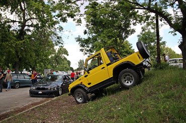 A Hungexpo szintkülönbségét kihasználva feltolatott egy domboldalra, amire tényleg senki nem mondhatta, hogy, hagyjad már, ezt a 20 éves Golfom is megcsinálja. Kicsit féltem, hogy lezavarják a bátor Suzukist, amiért ő a több száz parkolóból egyet sem talált el, de maradhatott, és ezzel közönség-kedvenc lett. Senki sem tudott elmenni mellette fotó nélkül, nem is tudom, én hányszor kaptam el a pillanatot, pedig órákig úgy állt.