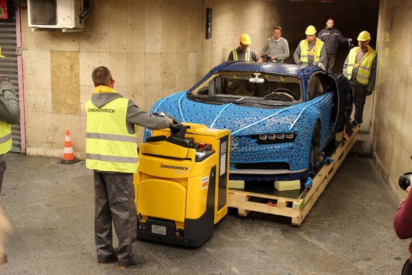 Kő profik voltak a Jungheinrich-es srácok, egy pillanatig nem volt káromkodás, feszülés. Volt egy feladat, amit meg kellett oldani. És ha két és fél óra alatt is, de megoldották. Voltak olyan pontok az útvonalban, ahol szó szerint centikre a faltól kellett a másfél tonnás Chiront tartó, vagy öt méter hosszú, minimum két méter széles raklappal tetriszezni. De karcolás, hiba nélkül megoldották. Igaz, így, hogy a kb. 500 méteres távot két és fél óra alatt sikerült megtenni, nem hivatalosan ez lett a világ leglassabb Bugattija - bár tény, hogy ezt a címet már korábban is kiérdemelhette volna, hiszen önerőből maximum 30 km/órás sebességre képes.