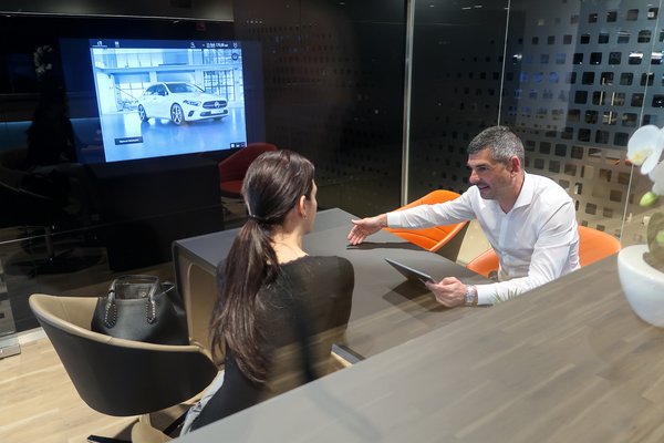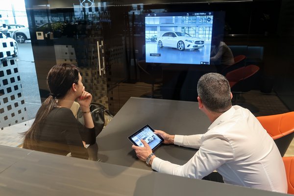 A komolyabb tárgyalásra már a szóban forgó kocsinak megfelelő hangulatvilágítású, elegáns kis tárgyalóban kerül sor, ahol a szakember táblagépén mennek végig a kívánt autó specifikálásán, miközben a képernyőkép, megjelenik a falon lévő, óriás monitoron. Papírmunka nincs, minden digitálisan megy, és a folyamat végén az ügyfél kap egy konfigurációs kóddal egy linket, amelyről az egész specifikációt megnézheti, módosíthatja otthon, sőt egészen másikat is összeállíthat. Nem érzi tehát azonnali, elhatározó döntés kényszerét, alhat néhányat a választásaira, megbeszélheti párjával, kikérheti barátai véleményét, tanácsát. Az egész körülbelül akkora előrelépés a régi, extralistán golyóstollal ikszelgetés után, mint az okostelefon megjelenése volt a drótoshoz képest.