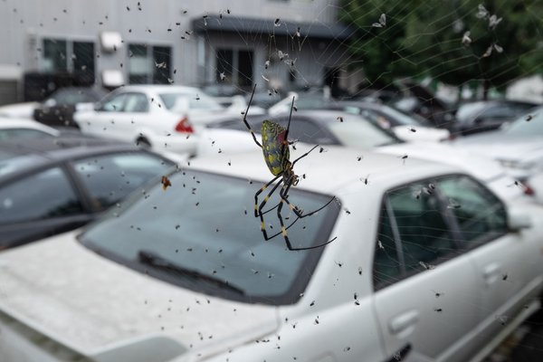 Ahogy a kerítésen át önfeledten fotózni kezdem a nyugdíjas izomautókat, valami zavaró piszok lobog a keresőben, el akarom hessegetni, mire Anti felordít - ne, ne! Elveszem a gépet a szememtől, akkora pók libeg a hálójában, félarasznyira az objektívemtől, mint egy kisebb tarantula. Csak emez szikár, inas, a testét maga Gaudi rajzolta, gyönyörű. De azért nem szívesen mászatnám magamon, Japánban létezik halálos csípésű pók, bár az ilyen színesek általában inkább csak optikailag riasztanak.