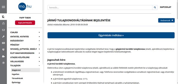 A hangzatos „Tulajdon” menüpont alatt csak ott volt a „Gépjármű” rovat, és lám, innen már gördülékenyen mennek a dolgok, ott van számos szolgáltatás mellett a gépjármű-átírás is. Maximum annyi megjegyzésem lenne a felhasználói felület tervezőjének, hogy ha látok egy vezetéknév és egy keresztnév mezőt egymás mellett, akkor rohadtul nem gondolok arra, hogy a másodikba a már a vevő leánykori (születési) nevét kellene beírnom, mert ezt pont sikerült így függőleges hasáb elrendezésben egymás mellé rakni, miközben az egész oldalon vízszintes a kitöltés sorrendje.