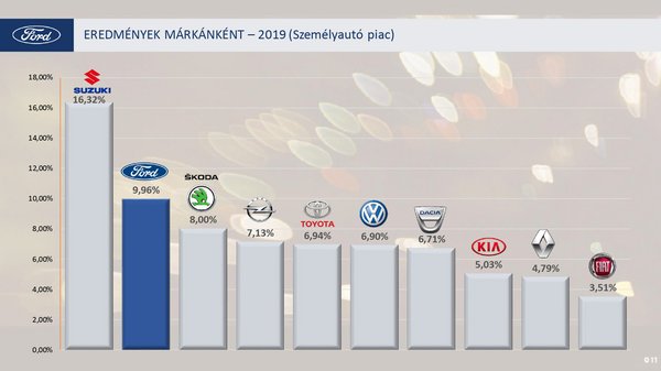 - A személyautók és haszongépjárművek összesített piacán 23327 gépjármű forgalomba helyezésével, 12,67% piacrészesedéssel 2019-ben a Ford szerezte meg a második helyet