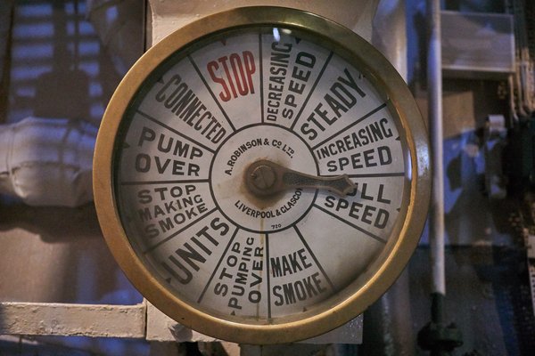 De lenyűgöző a hajó gépészete is. Természetesen gőz hajtja a cirkálót, ám ezt ne úgy képzeljük el, mint a 424-es mozdonynál, hogy szurtos képű fűtők lapátolják a szenet egy tartálynyi víz alá. Eleve olajat éget a négy kazán, ráadásul mire a Belfast megépült, már volt vagy 150 év fejlesztés a gőzgép mögött, úgyhogy az ilyen hajókon, a törikönyvekben is szereplő Dreadnought csatahajó óta, gőzturbinát használnak. A Belfast géptereiben rézcsövek, azbeszt szigetelések, figyelőablakok és visszajelző műszerek sokasága kápráztat, a rendszer, a gépészek szűk függőfolyosóin és létráin mászkálva gyakorlatilag átláthatatlan. Azért találtam ismerős feliratokat is, hiszen a hajócsavar tengelyét fordulatszámmérő figyelte, és ha jól látom, tárcsafék fogja meg, hogy menetirányváltáskor ne kelljen megvárni, míg lelassul.