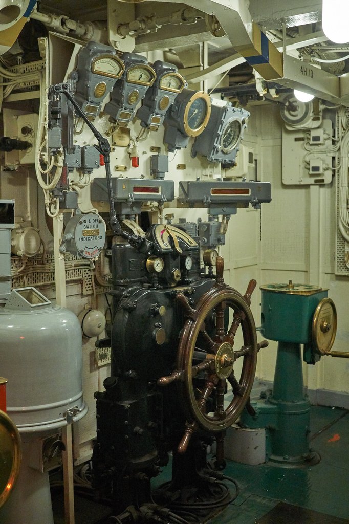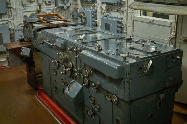 Ez még mindig nagyon leegyszerűsített összefoglalás, hiszen a radarok adatait például nem a tűzvezető központban, hanem a híd közelében olvasták le, ahol a többször frissített hajó 1961-es felszerelését mutatják be most. A négy lövegtorony fizikai kiszolgálása önmagában több, mint százhúsz embernek adott munkát harci helyzetben, a célzás, ahogy számolom, másik jó harminc-negyvenet biztosan lefoglalt, és ezek között többen is tulajdonképpen egy nagy, számítást végző rendszer részei voltak. Segítettek az adatok bevitelében és kiadásában az agynak, áramoltatták az információt, pontosítottak és visszacsatoltak az eredmények, azaz a lövedékek becsapódásai alapján. Nem véletlen, hogy békeidőben csak egyetlen tornyot tartott működésben a tengerészet, ma pedig már teljesen robotizáltak az ezzel összevethető haditengerészeti lövegek, akár egyetlen személy is tud velük pontosan lőni. Más kérdés, hogy ehelyett inkább rakétákat vetnek be.