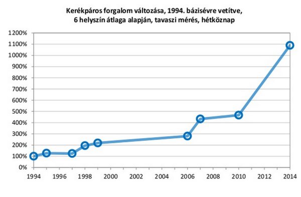 Nem győztelek meg a fenti példákkal? Nem csodálom, hiszen a budapesti kerékpáros közlekedés részaránya a kezdeti bumm után (1994-2014 között 11-szeres volt a forgalmi növekedés) megrekedt, évek óta 2-3%-ra taksálják (a belső kerületekben 10% is lehet). A fejlődés döntő része azonban a legnagyobb kerékpáros fejlesztések idején, 2010-2014 között következett be. Aztán megint változott az a bizonyos szélirány.
