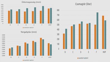 A csomagtér is bőven a SUV-ok előnye, ami a púpos hátuk miatt megint csak nyilvánvaló: bő 16%-kal több diszperzites vödör fér beléjük. Megjegyzendő, hogy a középső három szegmensben, ahol javarészt kombikkal vetettük őket össze, jóval kisebb különbségek (8%) mutatkoznak.