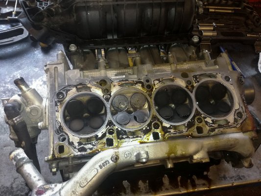 A vizsgálat a motor teljes felsőrészére, tehát a hengerfejre és a hengerekre, illetve a dugattyúkra is kiterjedt. Sem ezeken, sem a katalizátorokban és a leömlőkben nem látható sérülés, esetleg barbár szerelési nyom. Sőt, a jelentés a hengerfej kapcsán megjegyzi, hogy annak állapota megfelelő karbantartottságra utal. Feltételezem, hogy itt lehettek volna olajlerakódások, kokszosodás, vagy olajsár, ha korábban elhanyagolták volna az olajcseréket és/vagy nagyon rövid távokra mentek volna az autóval.