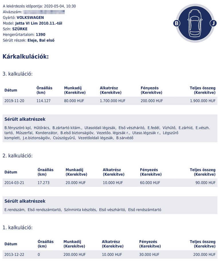 Felhívtam az autót hirdető HP Autó Kft. autókereskedését, ahol ezúttal bemutatkoztam, elmondtam, hogy mire gyanakszom és kértem, hogy nézzék meg a régi cikkemet. Közben más is történt. Mivel a hirdetésükben szerepel a Jetta alvázszáma, lekérdeztem a kártörténetét a Totálkár rendszeréből, így kiderült, hogy tavaly 1,9 millió forint értékű javítási kalkuláció készült hozzá egy sérülés miatt. Hihetetlenül furcsa volt, mivel szinte pontosan ugyanazokat az alkatrészeket sorolták fel az összefoglalóban, amelyek megsemmisültek a monori baleset során. Csak szinte, de erről később.