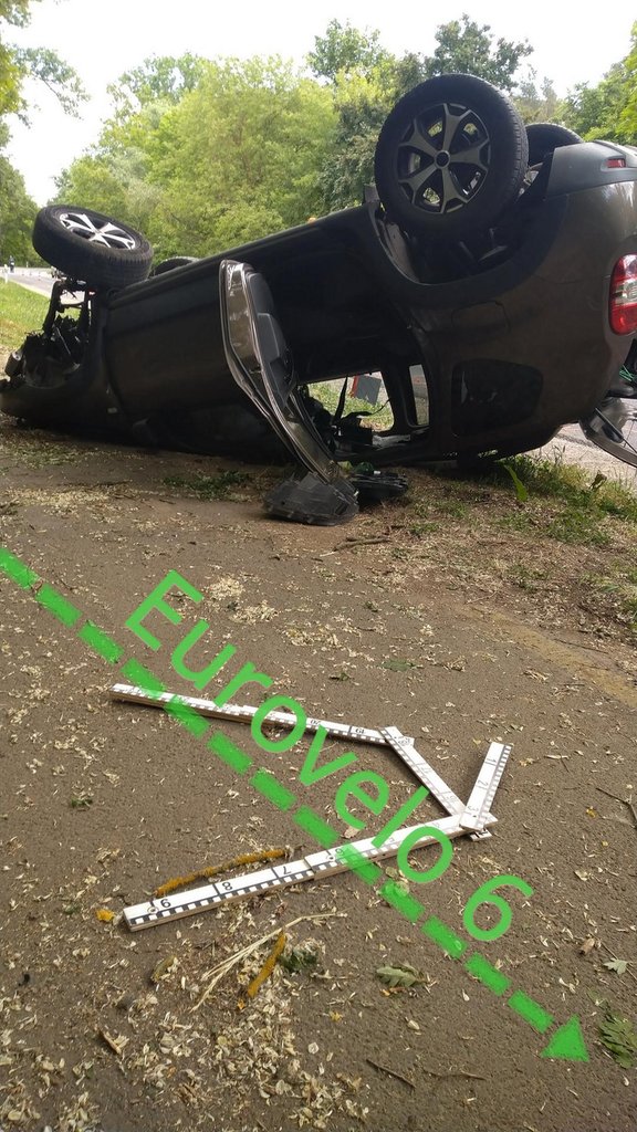 Ebből a képből ugyan elsőre nem tűnik fel, de az autó egy fának ütközést követően a bringaúton állt meg: