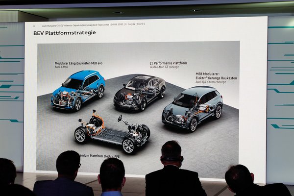 Sok szó esett még az Audi e-Tron hajtási rendszeréről, amiben aztán tényleg minden folyadékhűtéses és moduláris, aztán épp csak érintett egy témát, de nem beszélhetett róla sokat: mostanában elsősorban a PPE fejlesztési kóddal futó architektúra kialakításával foglalkoznak, ami pedig az MLB, azaz a hosszanti motoros, nagy, belsőégésű platform utódja lesz.