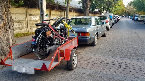 Az Avensist a feleségem Mercedesének helyére állítottam, az Avensis után fennmaradó helyre pedig a futót húzó Mercivel parkoltam úgy, hogy rálógtam a garázsfeljáróra. Amikor eljött a szállítás napja, már hajnalban felkeltem, hogy még legyen bármilyen másik parkolóhely az utcában. Felmálháztam a motort az utánfutóra, majd kiálltam a veterán autóval keresztben a garázsfeljáróra, készenlétben, mellesleg elállva a járdát (amelyen szerencsére nem sétált épp senki). A Mercivel futóstól elparkoltam máshova az utcában, amilyen gyorsan csak tolatni tudok szerelvénnyel, úgy. Hozzáteszem, nincs nagy gyakorlatom ebben, ezért ez alatt a halál vize többször levert. Amikor a Merci révbe ért, rohantam a házhoz, hogy villámgyorsan elfoglaljam az utána fennmaradó helyet a készenlétbe tett veterán autóval.