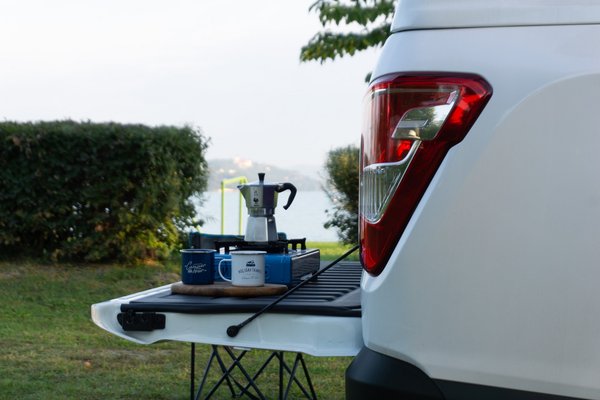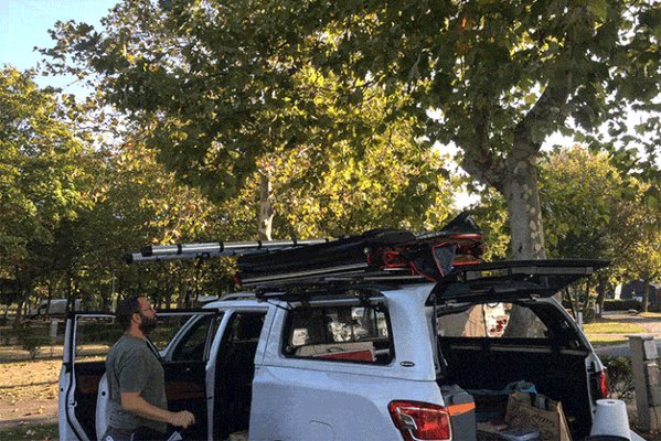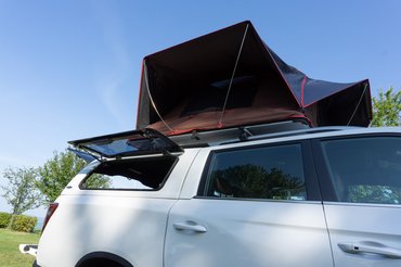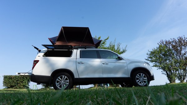 - Ha olyan szépen megtermett járműre raktuk fel, mint egy pickup, akkor kicsit nehezebb a dolog. A létra beakasztásával kezdünk, amit teljesen kitolva felfektetünk a tetőre. Ekkor a másik oldalán a létrát lefele húzva tudjuk kihajtani a sátrat.