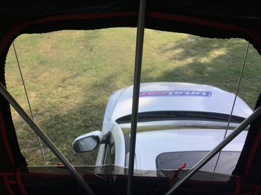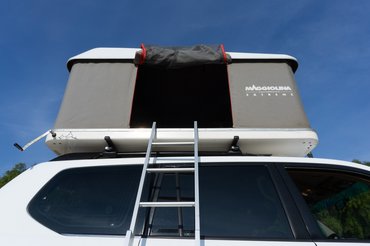 - Ha alacsonyabb az autó, kicipzározás és a biztosító kapcsok kioldása után egyszerűen kinyitjuk a sátrat az alapzatánál fogva, mint egy könyvet. Ezután beakasztjuk a létrát és a fokok mozgatásával vízszintbe hozzuk a két alapzatot. Ekkor nem árt figyelni, hogy a létra lábai megfelelő felületre feküdjenek fel, illetve a létra szöge se legyen túl lapos, mert ez fogja tartani az egyik oldalát a sátornak, és ha kicsúszik, az nem olyan jó móka.