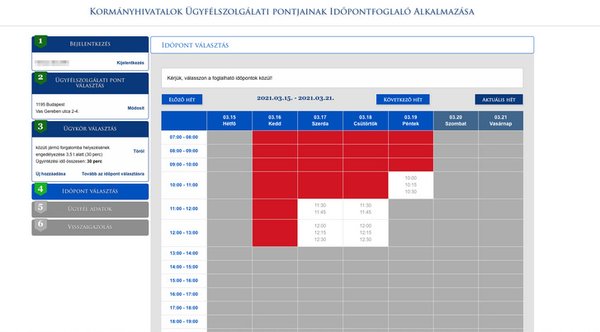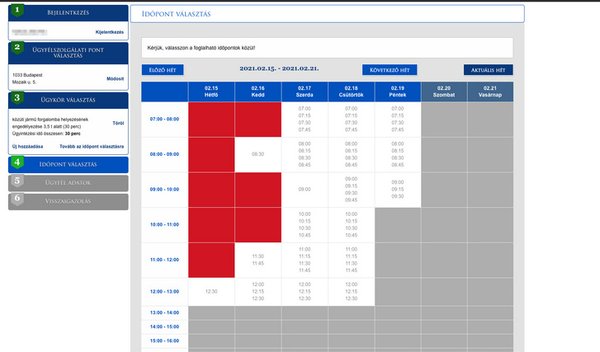 Az összesen több mint húsz megyei kormányhivatali állomáson most kétféle módon lehet időpontot foglalni, de kezdjük azzal, ahogyan a Mozaik utcai rajtaütés után megmozdult a budapesti rendszer. Létrehoztak egy Ügyfélkapu-regisztrációval elérhető netes felületet, ahol az autósok elektronikus naptárban választhatnak. Az alábbi képkivágás november 24.-i állapotot rögzít. E szerint a Vas Gereben utcában 2021. március 17. 11 óra 30 perc volt a legkorábbi időpont és a Mozaik utcai állomáson sem lehet már erre az évre bejelentkezni, csak február 16-ra.