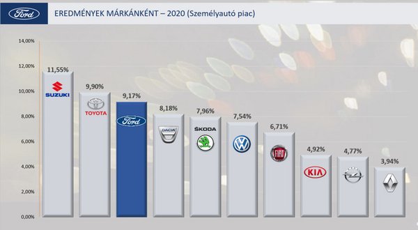 A személyautó-szegmensben a Ford a harmadik helyen zárt 11741 darab regisztrált személyautóval és 9,1 százalékos piaci részesedéssel a szegmensben köszönhetően annak, hogy a 2020 elején bejelentett hibrid stratégia keretében 14 új hibrid modellt mutattak be Magyarországon.
