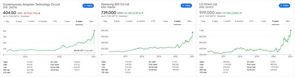 És ehhez képest így néz ki a három legnagyobb akksigyáré, elég a formákat összehasonlítani.