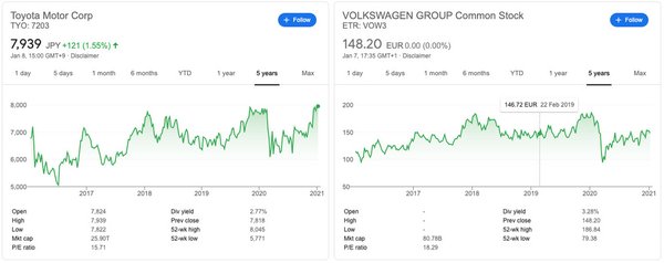 Mutatok még érdekeset: ilyen formájú a két legnagyobb klasszik autógyár árfolyama az elmúlt öt évben. Szép fűrészfogas, de nem nagyon tart a fellegekbe, azt leszögezhetjük: