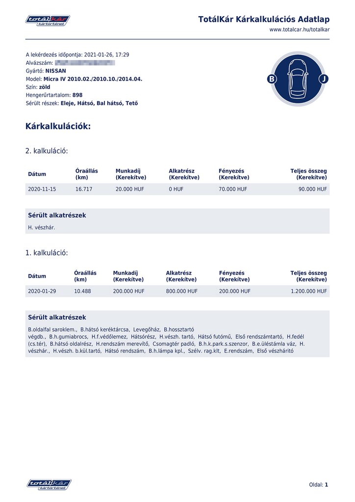 Az autó az ingyenes, állami Jármű Szolgáltatási Platform szerint csak rendőrség engedélyével idegeníthető el, saját, Totálkár kártörténeti szolgáltatásunk szerint 1,2 millió forintnyi javítanivaló keletkezett az autón a 2020. januári balesetben. Valóban cserélni kellett (volna) a jobb hátsó vázelemeket, sérült a tető és a futómű is. Hogy miért csupán a Gablini hozzávetőleges ajánlatának harmadát teszi ki ez az összeg, arra a biztosítói gyakorlat lehet a magyarázat: amikor kalkuláció közben kiderül, hogy az autó javítása nem gazdaságos, vagyis gazdasági totálkárossá minősítik, nem végzik el a teljes számítást.