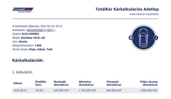 A jelentés szerint az autó eleje, hátulja és teteje is megsérült egy tavalyi balesetben, a javítás várható összege pedig 2,8 millió forint és rengeteg alkatrésze szorult cserére. Olvasónk így már nem akarta megvenni az Alfát szülei számára, de elküldte a Totálkár jelentését a hirdetőnek. Az illető azt írta neki válaszként, hogy a rendszerben téves információ szerepel, túlzó az összeg, túl sokféle alkatrészt sorolnak fel, a javítás olcsóbb és egyszerűbb volt.