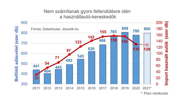 A hazai használtautó-piac meghatározó utánpótlási forrása, a használtautó-import 2017-ben, 155 ezer darabszám mellett gyakorlatilag csúcsra ért, majd két év stagnálást követően tavaly 17 százalékos mínuszba fordult. A kereskedők a visszaesés fő okát a magánimportnak a határzár miatti kiesésében látják, de sokan a koronavírustól független tényezőket is említenek. Egyrészt a romló forintárfolyam sem tett jót a behozatalnak, hiszen forintban csökkentette azt az árkülönbözetet, ami az import egyik fő hajtóereje. Másrészt szerepet játszanak adminisztratív okok is: a külföldről behozott használt autók első műszaki vizsgáztatását végző vizsgabázisok szűkös kapacitása miatt az év második felében jelentős várakozási idő alakult ki.