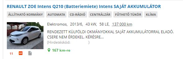 A Renault Zoékat azért tettem elég gyorsan félre a keresgélés közben, mert egyrészt a normálisabbak ára a négy millióhoz volt közelebb, mint a háromhoz, illetve ezeknél is van egy nem is olyan kis nehezítés. Igen, az akku. De nem az a gond, hogy nem lehet megmondani, milyen az állapota, hanem hogy simán lehet, hogy nem az eladóé az akku. Csak az autó. Mert hogy nagyon sok Zoét adtak el úgy (általában Nyugat-Európában), hogy a gazdája tulajdonába csak a kocsi került, az akkut csak bérelte, minden hónapban fizetett az akksi használatért. Így kevesebb pénz lekötésével lehetett valakinek villanyautója, ráadásul az elfáradt akkukat a gyár cserélte. Aztán persze leleményes emberek megvették a nem saját akkus autót, benne a bér-akkumulátorral, aztán az új gazdának esetleg elfelejtettek szólni, hogy előfordulhat olyan, amikor egyszer csak nem tudja tölteni az akkut, mert a gyártó letiltja.
