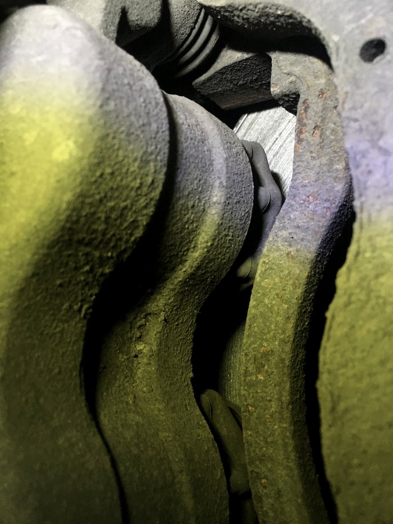 Mikor megérkeztek, a kerék és a féknyereg leszerelése után kiderült, a nyereg a csúszó csapoknál be volt rohadva, a külső betétet szinte egyáltalán nem feszítette rá a tárcsára, a belsőt viszont elkoptatta. Illetve az első csattanást és pedálbeesést az okozta, hogy a kopóréteg levált az vaslemezről. Innentől, mikor megint elérték a betét lemezét dugattyúk, vas a vason fékezett, ezért volt irtózatos hangja, és ezért fékezett egész kielégítően – vas a vason jól fog, lásd vasút, csak nagyon kopik. Így aztán eljött a pillanat, amikor a beállt nyereg pozíciójának és a vasak kopásának köszönhetően a lemez is kiesett a helyéről. Innentől értek össze a dugattyúk a féktárcsával.