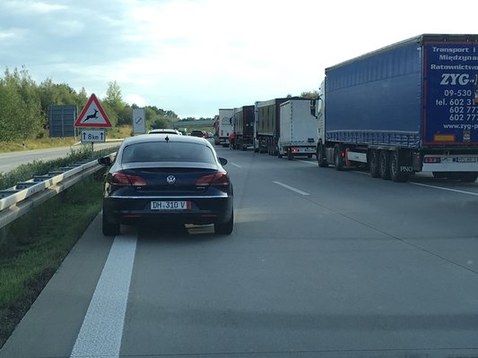 Minden szépen és olajozottan ment, még útközben tudtam venni üdítőt, meg rágcsálnivalót is (a sós-mézes mogyoróval mindenki vigyázzon, átkozottul függővé tudja tenni az embert). Rendes tempót tudtam diktálni, haladtam, ahogy csak tudtam, mert sose lehet tudni, nem jön-e közbe valami út közben. Mint például a szembe sávban az a kamion, aminek a fülkéje a szántóföldön, a többi része meg az árokban pihent, mögötte kilométeres, centit sem mozduló sor. Mekkora mázli, hogy nem az én oldalamon történt. Aztán kicsivel később feltűnt a tükrömben egy vibráló, kék fényhíd. Alatta egy ezüstmetál Ford Ranger, orrán Polizei felirat. Én olyan 160-nal mehettem, amikor a pickup sziréna nélkül megelőzött. Hogy ezek ilyen tempót tudnak? Csak azt nem értetem, miért nem szirénázott. Nem sokkal ezután újabb kék lámpa a tükörben, de ez már szirénázik, és olyan kétszáz körül tolhatták a Passatnak. Húbaszki, ez nagyon siet valahová… A Rangert üldözi, vagy mi van? Itt elkezdtem meregetni a nyakamat, rossz előérzetem támadt. A következő kanyarban már látszottak is a vészvillogók, mindenki nyomta a satuféket. Később, a hírekből kiderült, egy nagyon csúnya és nagyon szomorú baleset miatt állt be az autópálya. Pár kilométerre a német-cseh határtól. Kezdtem kicsit nyugtalan lenni, az éjfél előtti határátlépésem kezdett megoldhatatlannak tűnni.