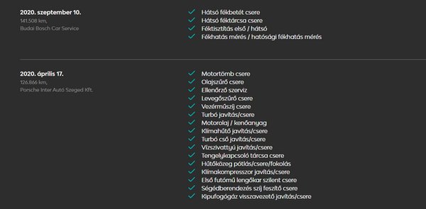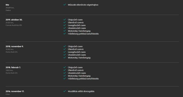 A különböző használtautós oldalak zavarosában nagy betűvel kiemelt fegyvertény, ha az autóhoz tartozik szervizkönyv, ami egészen a közelmúltig golyóstollal és pecsétekkel telenyomott papírköteg volt. Ezekkel - hamisíthatóságuk okán - eddig is érdemes volt vigyázni, de a CarNexthez hasonló profi kereskedések emiatt is álltak át a digitális jegyzékre, ami átláthatóbb, ráadásul szinte lehetetlen meghamisítani. Az ebben található tételek mind visszakövethetők és leellenőrizhetők, de konkrét árakat és az elvégzett munkáról kiállított számlákat ne várjunk, mivel a legtöbb esetben egyedi megállapodás van a kereskedő és a partner-szervizek között.