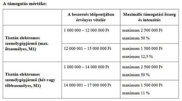 1-12 millió forint közötti, legfeljebb ötszemélyes villanyautókra a legnagyobb felvehető támogatás 2,5 millió forint lesz, amely legfeljebb a vételár fele lehet, míg a 12-15 millió forint közötti, legfeljebb ötszemélyes villanyautókra maximum 1,5 millió jár, amely a vételárnak maximum a 12,5%-a lehet. Ez utóbbi fontos változás, ugyanis tavaly a magasabb ársávban mindössze 500 ezer forint támogatás volt, amit kevésbé talált vonzónak a piac, jellemzően nem a jobban felszerelt, nagyobb hatótávú modellek fogytak.