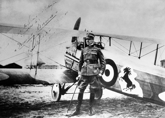 Amikor a múlt század tízes éveiben a katonák felfigyeltek a repülésre, Baracca is átváltott a modern fegyvernemre. Repülőgépére az akkori divatnak megfelelően szinte minden pilóta egyéni azonosító jelet festett. Baracca korábbi ezredének jelét tette gépére, de kissé átalakította. Az ágaskodó lovacska (olaszul: cavallino rampante) piros színt kapott, és mellé – a második lovasezredre utalóan – egy kettes számot is rajzolt. Később, amikor vásárolt magának egy fekete lovat, a gép jelzésében is feketére változtatta a ló színét, elhagyta a kettes számot, és a ló alapja fehér felhőre változott, mintha azt akarta volna üzenni, hogy az égi lovagja.