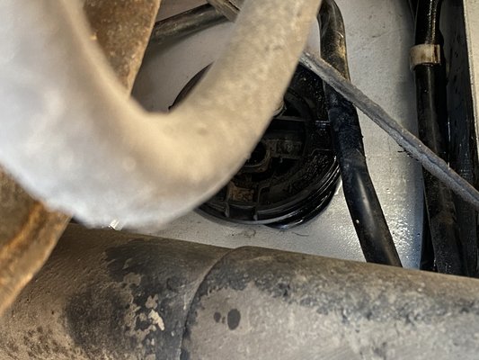 A másik szerencsém az volt, hogy a benzinkút melletti szerviz vezetője szokatlanul korán jött be, és ő sem tudta megállni, hogy ne feküdjön az Astra alá. A műhelyt feltúrtuk, amennyire lehet, és egy dízel BMW olajszűrőtömítése tűnt a legalkalmasabbnak, hogy legalább valamennyire gátolja a folyást. Ezúton is hatalmas köszönet a segítségért. Mire idáig eljutottunk, már eltűnt annyi benzin, hogy lement a nyílás szintje alá, tehát legalább ez könnyítette a szerelést.