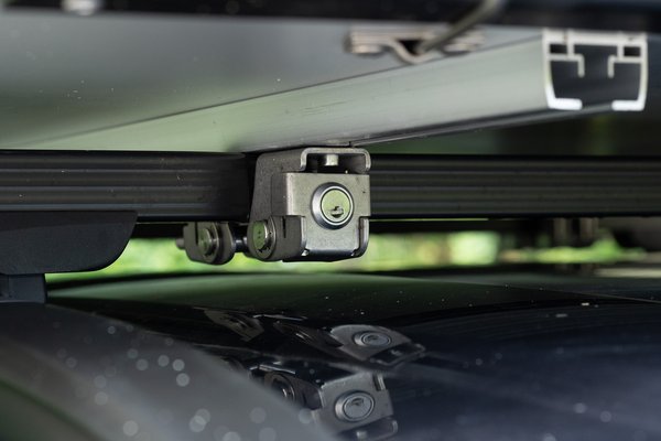 Célnak Tokajt, illetve a Bodrog vidékét jelöltük ki azzal, hogy első este megállunk rendes kempingben, aztán ha nem válik be, vagy lobog bennünk a kalandvágy, továbbmehetünk vadkempingezni. De odáig el kell jutni, és bár a Skycamp Mini elvileg tökéletesen a Lodgyra való méret – a gyári termékoldalon egy Mini Countryman tetején fotózták le – én azért erőst izgultam. Pedig feltenni igazán nem ördöngösség, mert a rögzítő rendszere nagyon ügyes. Sínen szabadon csúsztatható a négyszer két bizalomgerjesztően bika fém konzol, és ezeket egy-egy átmenő csavar fogja össze alulról. Azaz a szokott ezer alátét és anyacsavar helyett mindössze négy helyen kell imbusszal meghúzni, és ha véletlen elszúrnám, vagy meglazulna, leesni akkor sem fog – csodás. Annyi hátránya viszont van, hogy a szabadon mozgó konzolok miatt egy picit mindig elkúszott a sátor alja, amikor meghúztam a csavarokat, így nem sikerült tökéletesen központozni, szóval ha valaki csak élére állítva viseli el a dolgokat, sokat fog szöszölni vele.