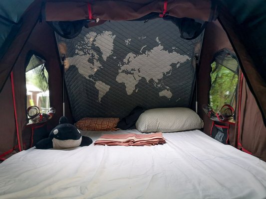 Tokajnál a Tisza partján laktunk be egy kempinget, ahol némi morfondírozás után lakóautónak könyvelték le az ezen kissé csodálkozó Lodgy-t – így felár nélkül járt a parkolás és az áram, úgyhogy nem tiltakoztam. Kerestem tehát egy árnyas placcot az egyik konnektortól hosszabbítónyi távolságra, de olyat, hogy a Dácsija orra felé egy picit lejtsen, a Lodgy teteje ugyanis meglepően hátracsapott, tökéletesen vízszintes parkolóban tehát a sátor padlója hátrafelé dőlne. Ez végül simán ment, azt viszont már csak lefekvéskor vettem észre, hogy egész picit oldalra is dőlt a kocsi, így nem lett tökéletesen vízszintes mégsem a fekhely – ennyit a párnákkal ellentételezni tudtunk. Igen, párnákkal, hiszen ha már luxus kivitelű a sátor, ne bohóckodjunk hálózsákkal: rendes ágyneműt csomagoltunk alváshoz.