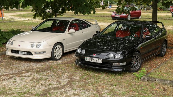 Ahogy sétálok a sorok között, megakad a szemem a fekete és fehér Honda Integra Type-R pároson. Hogy a fák árnyékában hűsölő kétajtós kupék duettje jin és jang volna, azt nem állítom, de az egészen biztos, hogy nem az angyal és az ördög párosa. Mert bármennyire is úgy tűnik, az ártatlan fehér sem kevésbé súlyos gép. Minden idők legjobban vezethető elsőkerekes sportautója az Integra és ezt temérdek YouTube videó mellett olyan szerencsések állítják, akik vezették már nem csak a sarki boltig, hanem versenypályán hajtva.