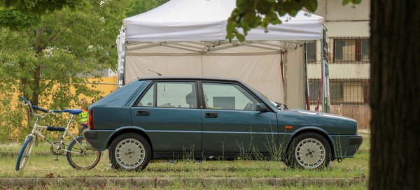 Pár lépéssel odébb három Lancia Delta álldogál és akkor állapítom meg, hogy mennyire jót tesz minden autónak a sárvédőszélesítés. A HF Integrale pontosan annak néz ki, ami: egy kompakt, amit belülről feszít szét a technika. 200 lóerő körüli 2,0 literes turbómotorja úgy tölti ki a rendelkezésre álló teret, mint a levegő és akkor még ott van alatta az összkerékhajtás is. A Turbo DS-en látszik, hogy sokküllős felnik és a szélesítések nélkül, sallangmentesen is mennyire működik a forma, aminek megrajzolásához valószínűleg Giorgetto Giugiaronak kizárólag vonalzót és ceruzát adtak a kezébe.